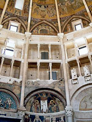Qui il grande testo per immagini che caratterizza tutta la costruzione si dispiega nella cupola, dipinta da maestri bizantini tra il 1260 e il 1270. Nelle lunette interne simmetriche e in quelle esterne, scolpite da Benedetto Antelami, è evidente la traccia dei colori che ricoprivano le figure, come nella serie delle grandi statue dei mesi, fra le più notevoli dell'intero complesso. Al centro sorge la grande vasca per il battesimo ad immersione, mentre lateralmente si ammira la cosiddetta "ara antelamica". La cupola è costruita come immagine della Gerusalemme celeste, alla quale portano idealmente le storie di Abramo, di Giovanni, gli apostoli e i Profeti con il Cristo intercedente e la Vergine. Altre statue dell'Antelami (gli Arcangeli, il Re Salamone, la Regina di Saba, ecc.), che in origine arricchivano le facce esterne del Battistero, sono state ora collocate nelle sale del vicino Museo Diocesano.